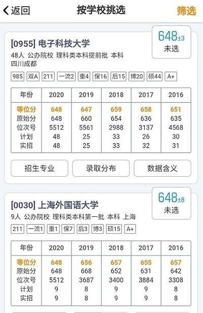 2、根据历年高校招生数据,准确筛选出大致可达到的学校名单。