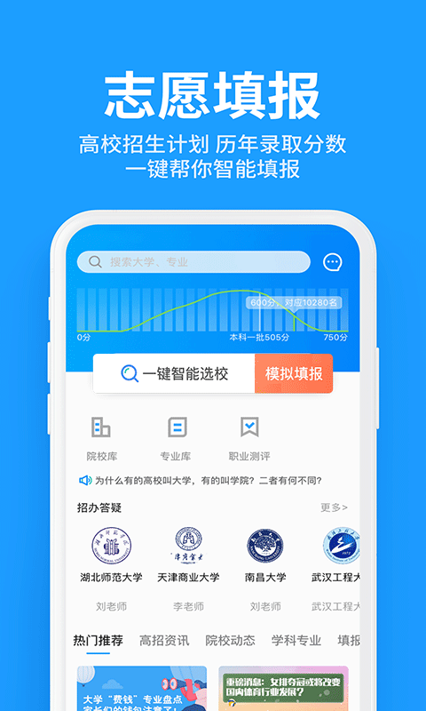 1、从历年各高校海量招生数据中进行科学推演和精准匹配,通过智能推荐,轻松找到对口的院校和专业。