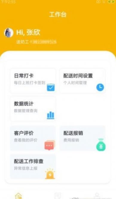 3、奶站效率配送工具,App为奶站配送员提供上班打卡、客户评价、配送报销等功能。