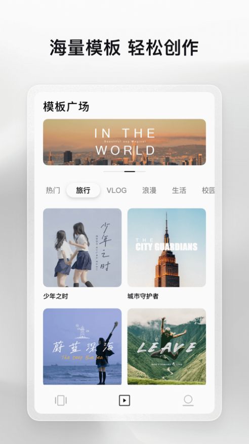 2、选择一个满意的模板即可快速使用,应用的视频创作模板多样,其中包含了旅行、生活、艺术等种类,能够让用户自由选择并设置。