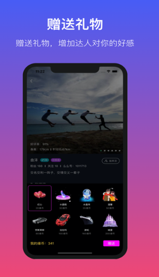 4.用户可以选择自己心仪的达人一起吃饭、看电影、跑步、健身、游戏等。
