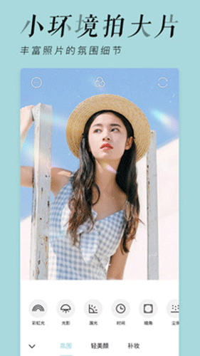 2、也可进行微调整,比如说可选择光影、漏光、贴纸等氛围处理,或者是轻美颜、补妆处理,很自然大方漂亮;