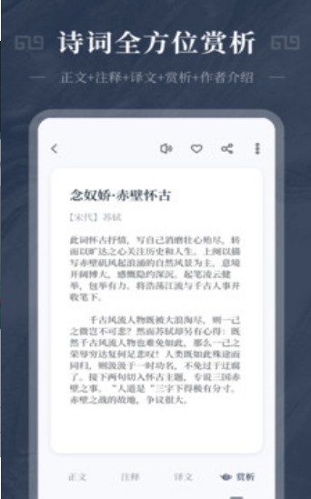 1、用户可以在这个软件中更好地学习各个朝代诗人的名著,诗歌下面会有详细的注释;