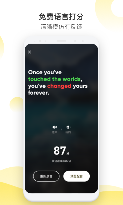 3、为您提供免费专业语音打分、在配音时准确了解自己发音准确率,纠正发音问题。