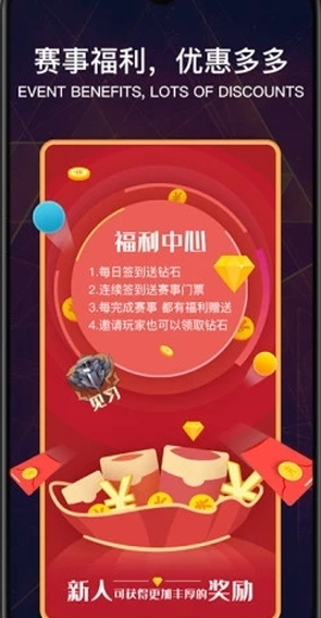 1、涵盖了多种类型的电竞功能,提供了赛事信息、福利中心、游戏商城、电竞活动等多种功能服务。