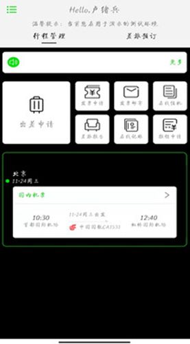 3、为用户提供预订国内外机票、酒店、火车票、打车、报销、审批、出行、行程管理等一站式服务。