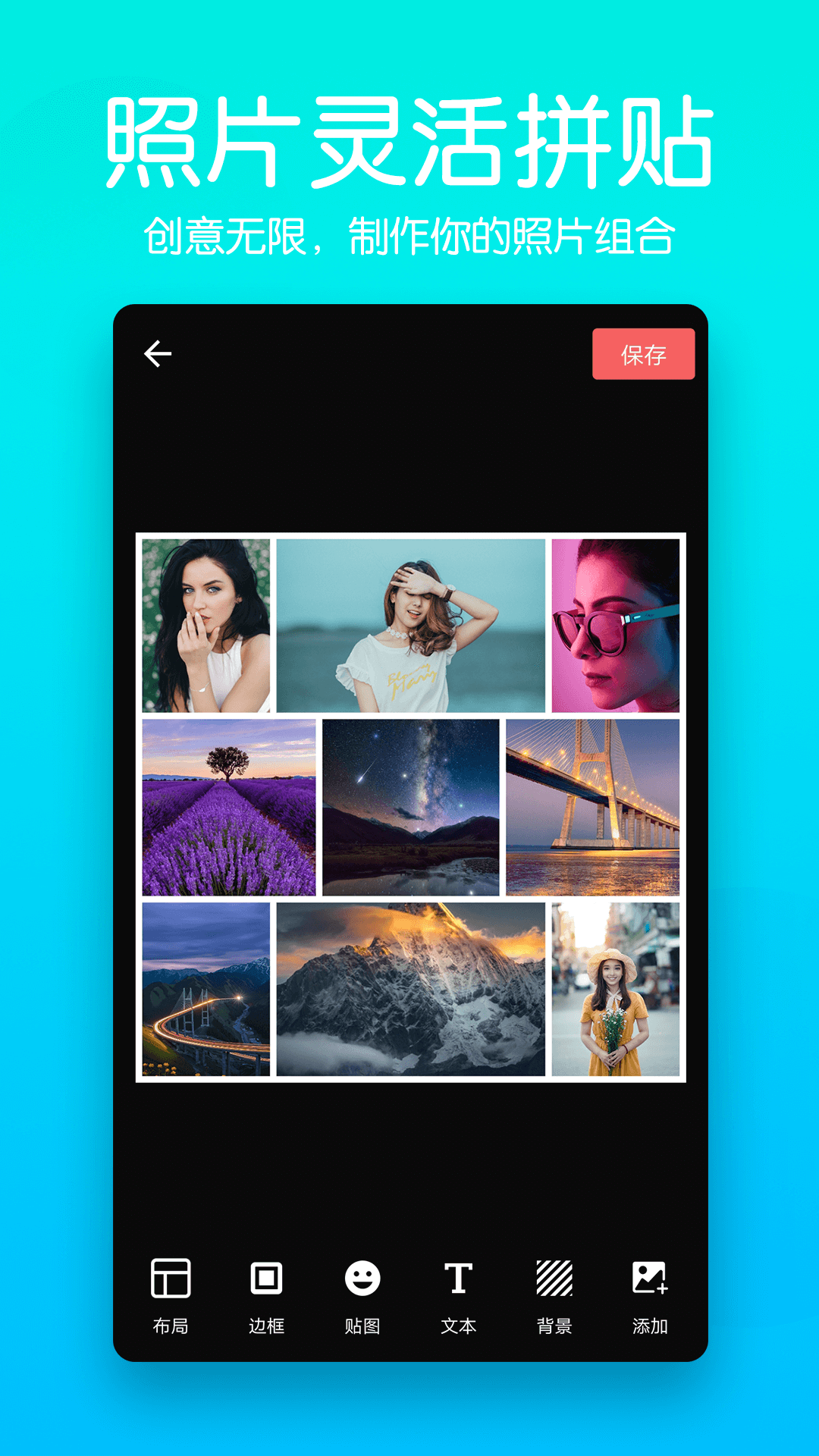 3、各种很酷的拼贴画布局,具有模糊和飞溅效果;涂鸦和文字,为照片添加精彩的背景,字体和标签。