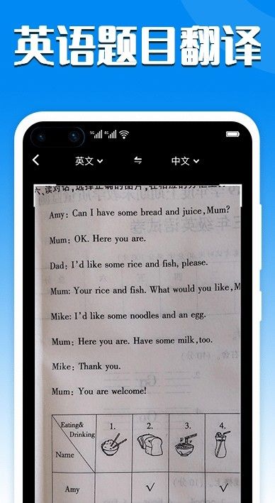 2、 拍照翻译: 可使用相机将拍摄的文字即时中英互译, 并多种语言和英文间转换。