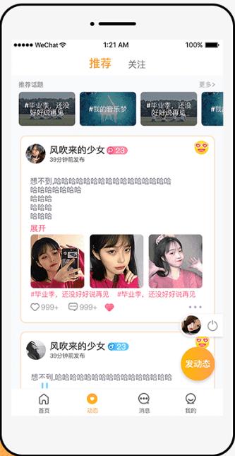 4.软件包括了首页直播间列表、动态、消息、个人中心四个主要模块,满足你的多样交友需要。