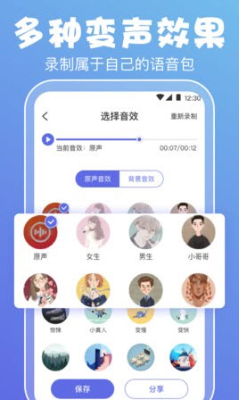 各种音效都有,用不同的声音去聊天,还可以录制下来发送给朋友