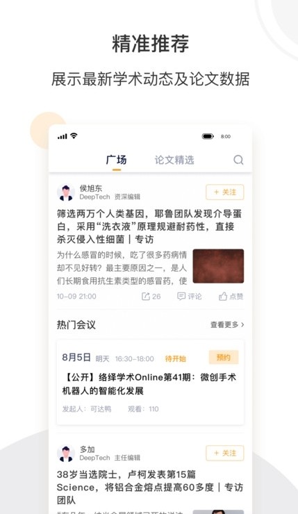 2、【直播互动】每日精选热点论文,邀请作者、领域专家进行直播解读;定期组织在线学术交流会,用户可报名参与连线。