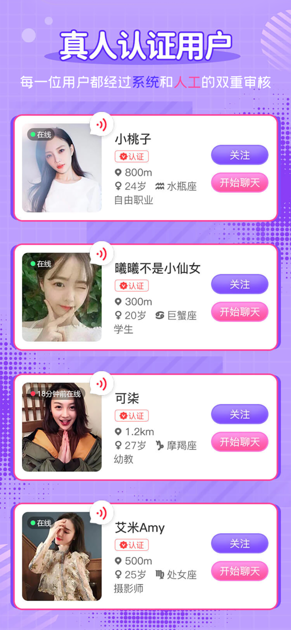 2、【真实交友】拒绝机器人回复和不真诚的交友行为,真人认证+AI算法+24小时审核,保障安全可靠的交友体验!