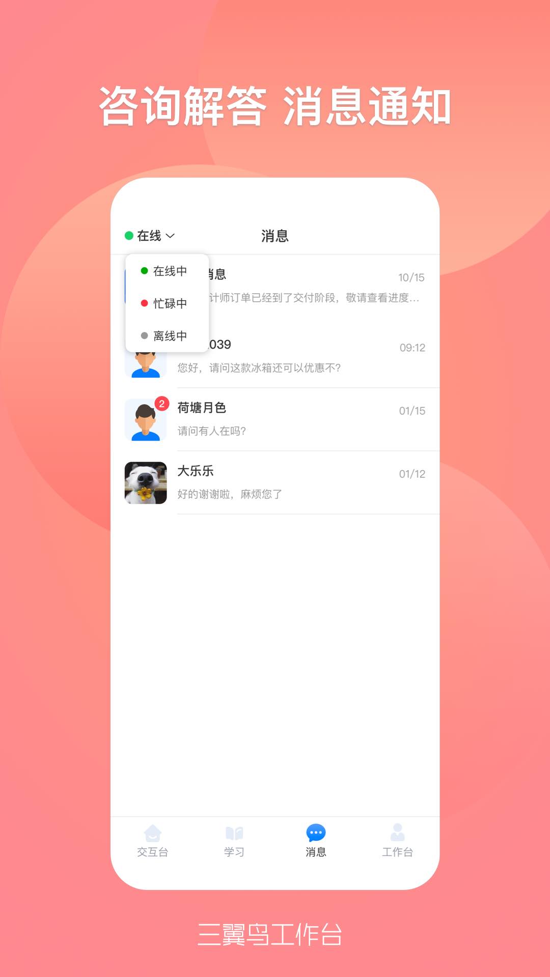 三翼鸟工作台app是专为办公人员设计的移动办公app,线上办公功能设计十分齐全,店客交互能有效的提高工作人员的效率,简单轻松的操作体验,大家可以在其中精准的处理各种咨询信息,给办公人员带来更多的便利,有需要的用户可以在本站下载。