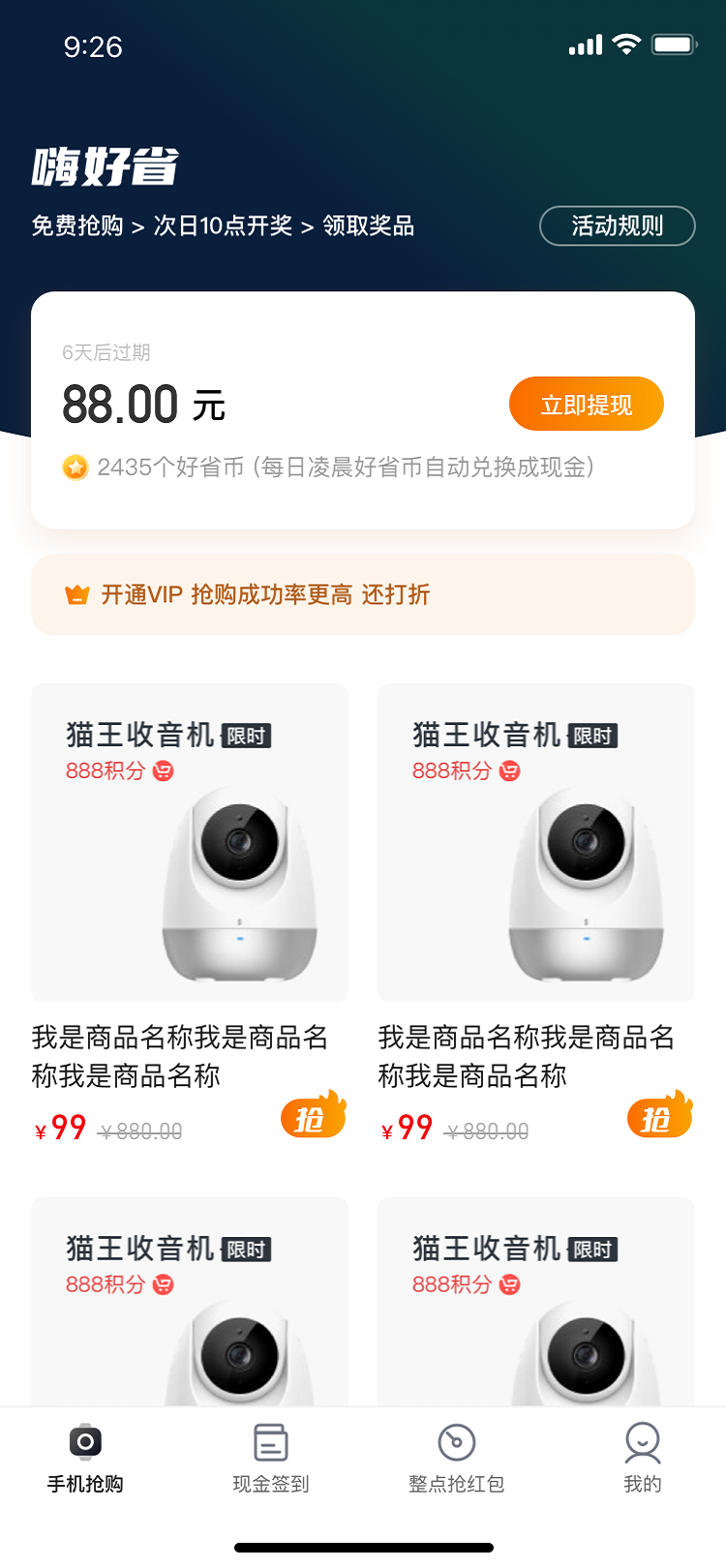 2、每日9.9元抢购好物——700克精选黑猪肉、4份中杯品牌咖啡、100元打车券、100元品牌雪糕代金券、原价81元炸鸡全家桶、网红行李箱、自热火锅等仅需9.9元;