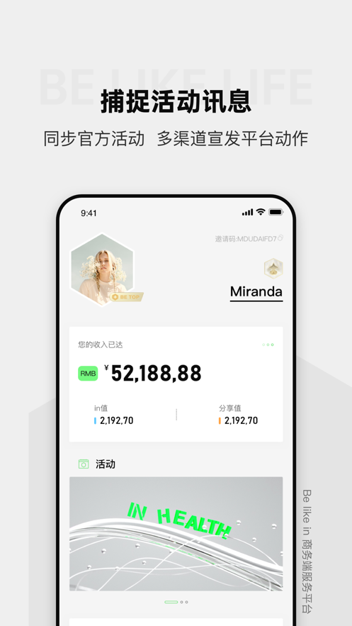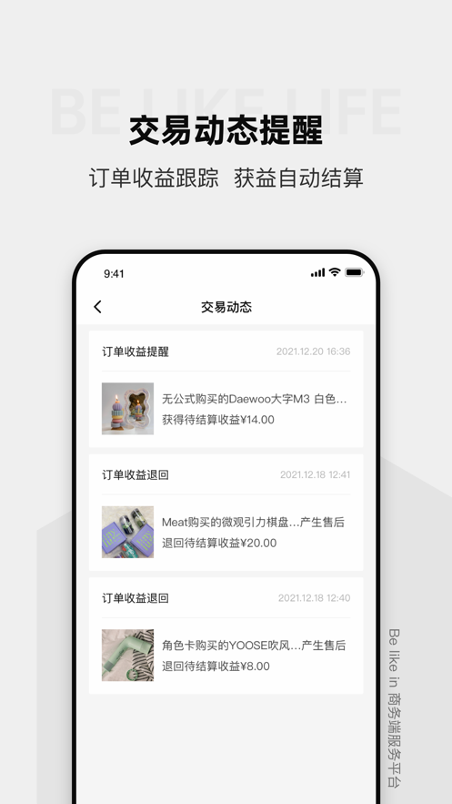 BeLikeLife app是一款专为经销商服务的线上平台,软件具有强大的管理功能,用户可以在线上直接查看收益和积分等信息,还可以进行高效的管理客户,并且还可以及时的获得最新的新品信息和活动资讯,提高经销商的办公效率,操作非常的简单便捷。
