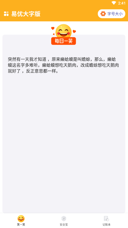 易优大字版app是一款休闲娱乐软件,软件具有丰富的新闻资讯可以让中老年用户进行阅读,全面的类型可以满足中老年用户的不同阅读需求,软件还有其他常用的小工具可以让用户们免费进行使用,都是平常可以用得到的,使用起来也是非常简单的,为我们的生活带来了很大的便捷。