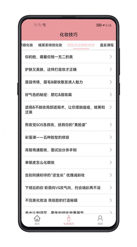 化妆技巧app是一款线上化妆学习软件,多种化妆学习课程可以让用户们免费在线学习,各种妆容的详细课程都可以进行了解,满足每一位用户的日常化妆需求,不同的五官脸型适合的妆容也是不一样的,你可以根据自己的五官来查看一下自己最适合什么款式的妆容。