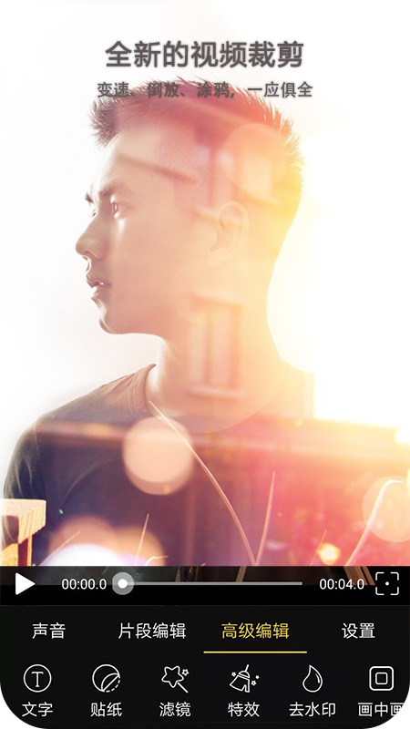 2、转场、分割、快放、慢放、贴图、音乐剪辑,多种剪辑效果为你的视频增光添彩;