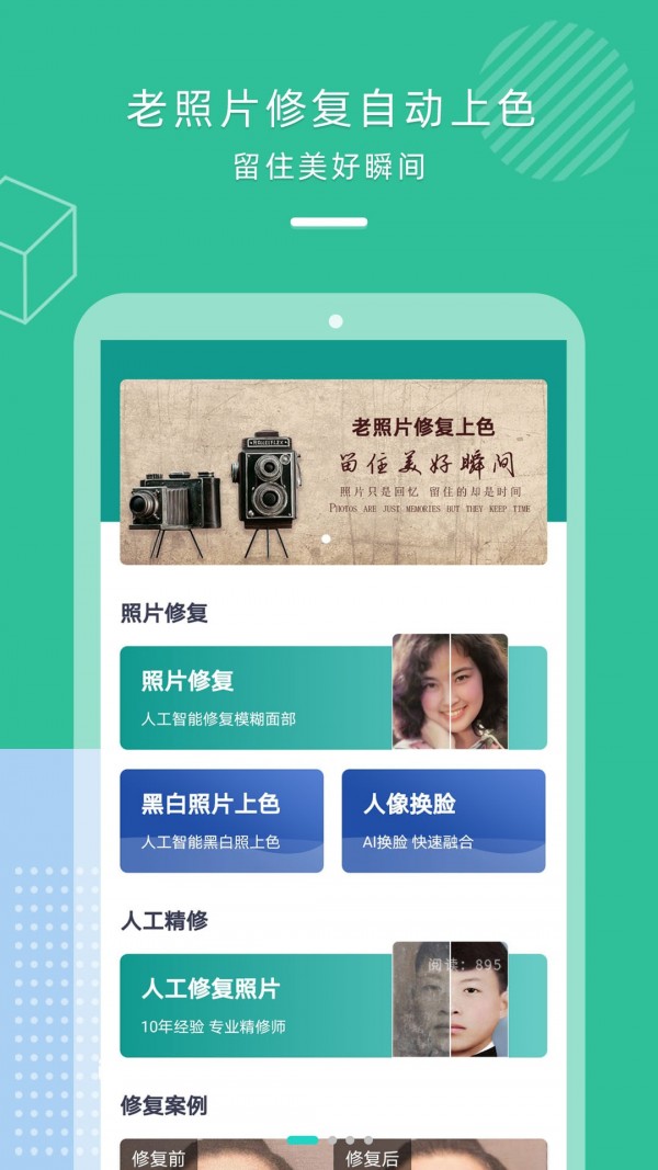 黑白照片上色修复:这个软件能帮助用户智能的修复老照片,先进的al智能服务一键即可迅速的修复还远老照片了,不管是图片上色还是噪点修复点击修复工具就能自动进行了,超级方便的修复功能现在提供给你,除此之外应用还支持al换脸,将需要换脸的素材导入即可一键融合了,感兴趣的话就来本站下载体验吧。