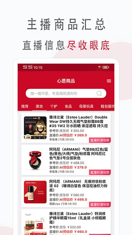 5、开播即可第一时间收到消息,设置关注主播,实时推送该主播的直播预告,帮助购物轻松省钱。