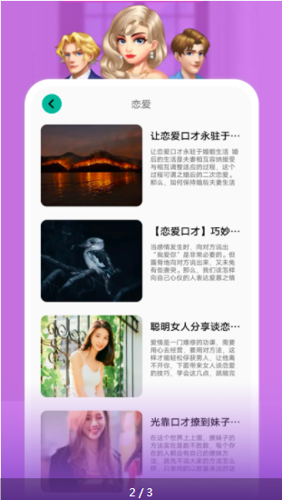 1、平台上有着非常多的各种场合的聊天术语,还有非常多的关于恋爱的资讯内容可供用户去学习。