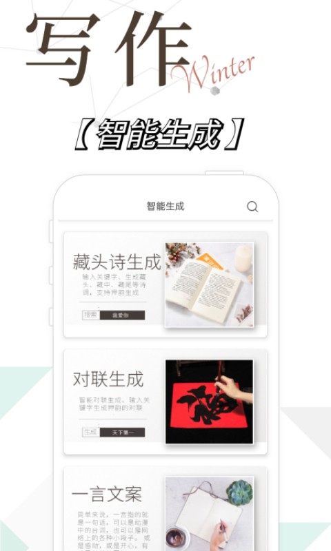 写作精灵是一款适合写作的手机软件,里面的每一个写作的工具和服务都是可以在线免费使用的,且这些工具都是非常的强大的,用户也不用担心自己的下载的问题,平台的下载安装是非常快的,而且没有广告的介入,使每一个用户在里面都是可以静下心去进行写作的,如果你也有需要这样的手机写作的神器,那就一件下载试试吧。