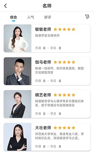 3、发现各种各样的名师,每个老师都可以查看具体资料,及时的了解。
