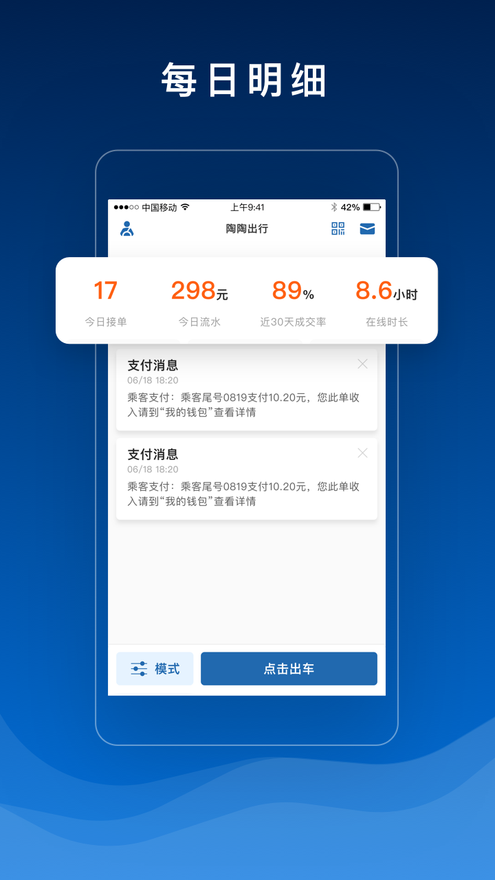 5.根据司机当前条件和预约信息智能发单,快速通知,提高成交比例,同时提高司机收入。