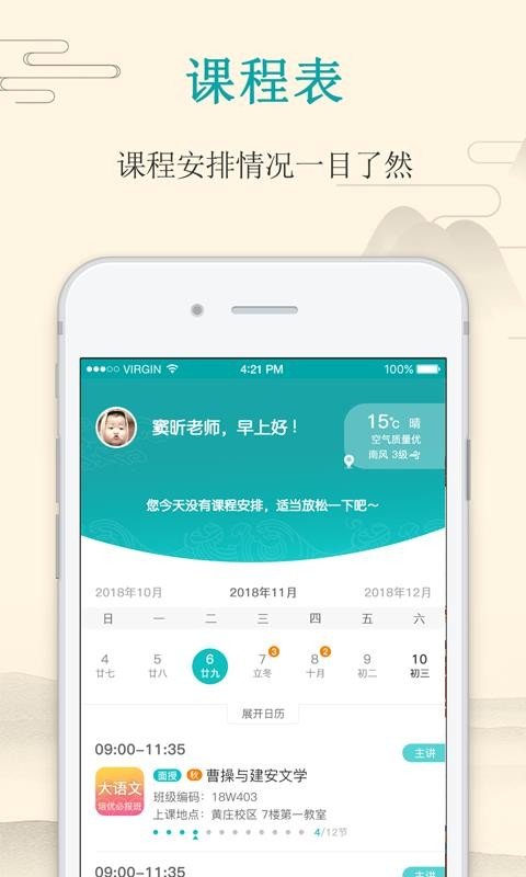 3.授课:教师授课课表一目了然,上课实时准确提醒,教师还可以添加上课提醒,设置课前闹铃,是教师上课的好助手