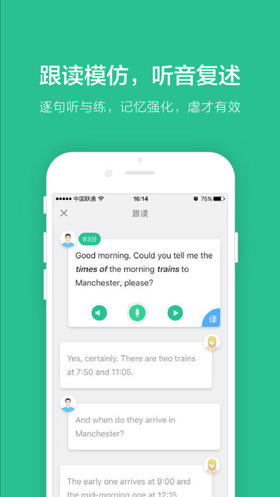 3、很好的学习软件,方法也很好先跟读后复速,增加记忆深度,听过对比听发音,纠正发音。