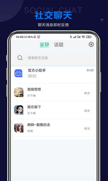 Star Chat星聊是一款十分精彩的手机互动的服务软件,让你可以轻松的找到自己专属的一半,也可以去进行自己感兴趣的线上的社交,用户想要的模式都有上线,有视频和语音等模式的互动,还有话题的连麦的参与,然后你的交友实现最大化的服务,体验全新的网上交流的模式,让每一个单身的用户都可以快速的脱单哦。