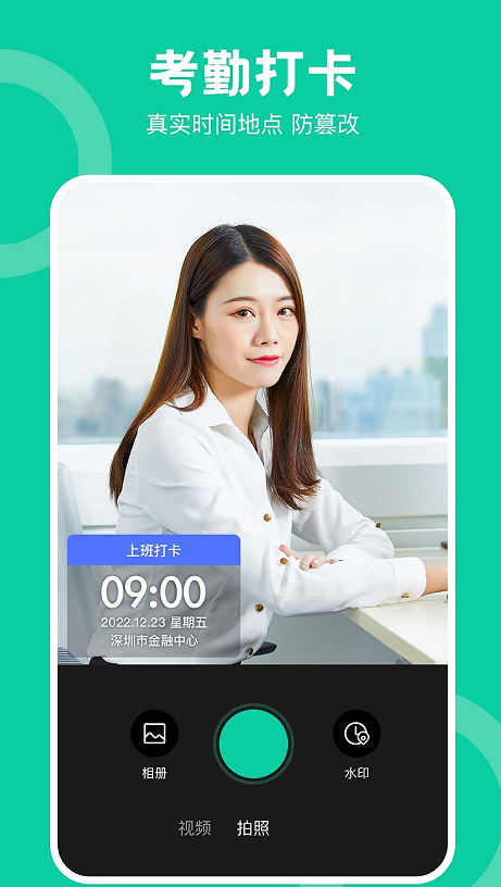 1、工作生活照片加水印、照片拍摄添加水印、考勤打卡、物业工作记录;