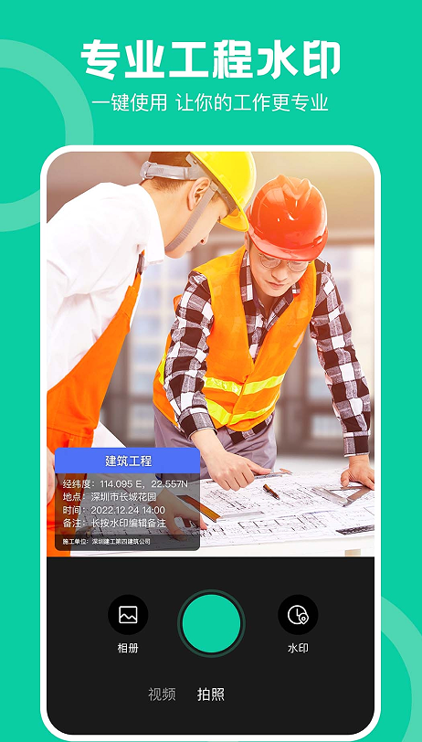 2、建筑工程管理、外勤拍照、成长记录加水印、旅行记录打卡;