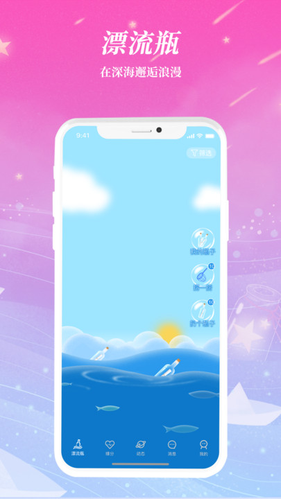 3、每天搭讪互动,茫茫人海中,注定会有有缘人,漂流瓶互动,在深海邂逅那个TA;