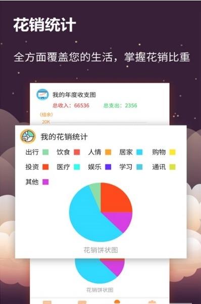 3、统计图表:自动生成收支统计图、曲线图等,清晰知道你的收支构成。