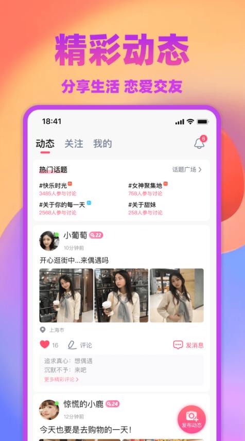 1、精彩动态:你想去分享日常生活的话就到这个恋爱交友的软件之中来吧,动态信息度能查看。