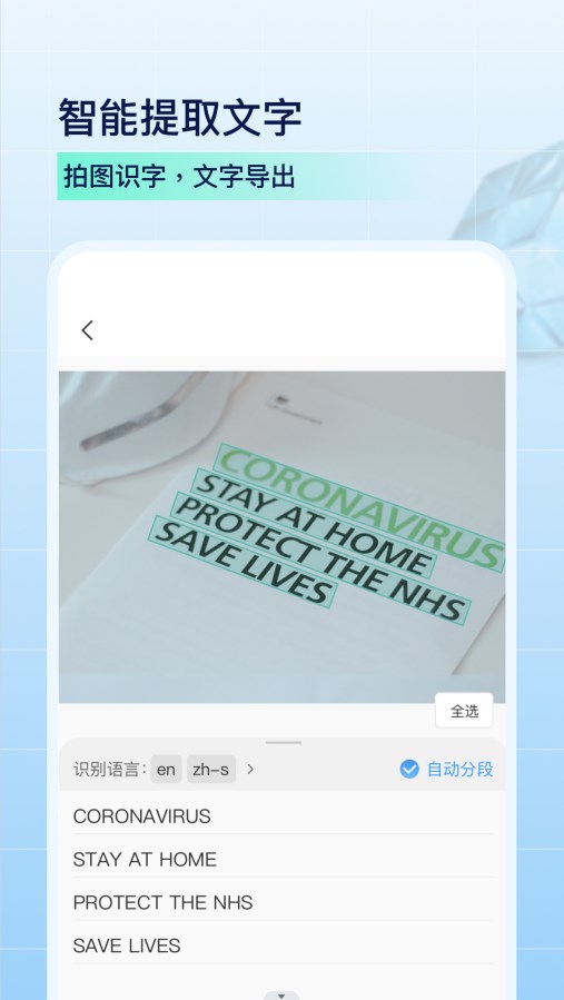 图片只能修复也轻松,快速图片或者是pdf文件中的文字,保存到手机上,更多功能等你来挖掘!