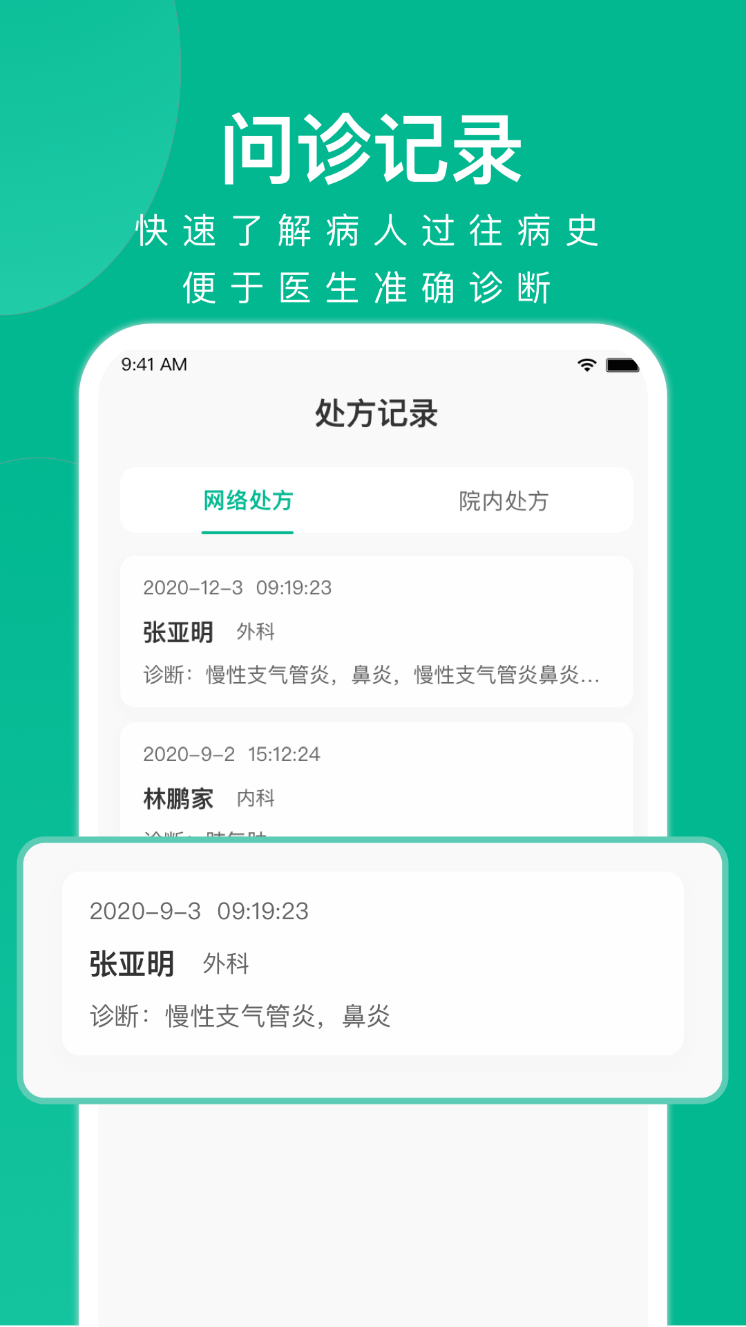 1.【在线问诊】在线接诊,与患者进行图文、语音、视频问诊,医患交流更高效。