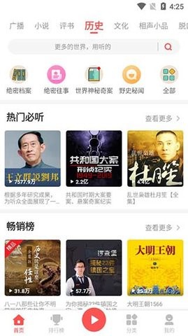 1、历史:绝密档案、易中天品三国、野史秘闻、王立群讲宋史、世界神秘奇案