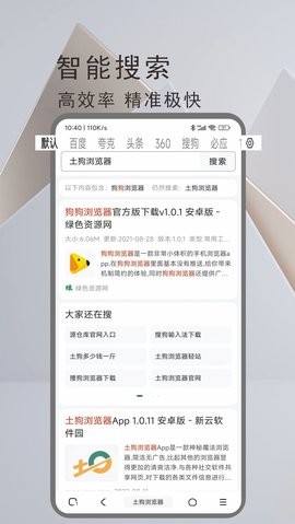 土狗搜索是一款功能十分强大的浏览器应用软件,在这里用户可以随意搜索,这里的资源类型非常丰富且齐全,可以满足不同用户的需求,为用户提供了巨大的便捷,备受用户们的喜爱,为用户提供了非常优质的服务,小说资源,影视资源等内容应有尽有,感兴趣的小伙伴们,快来下载体验吧!