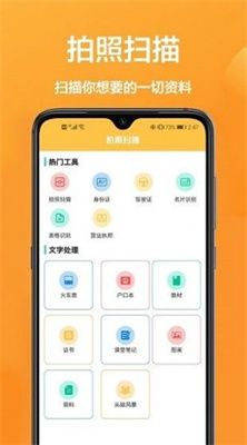 1、文字扫描:扫描各种文件、图片、书籍、名片等提取想要的文字,可对识别的内容进行编辑、复制。