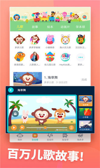 百万儿歌故事、动画绘本、儿童游戏、早教童谣、亲子游戏……更多优选内容给孩子一个快乐的童年。