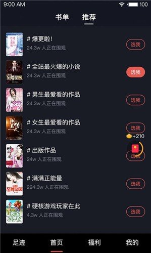 多个页面,例如主页,主题页面,书籍页面,阅读页面等,显示浮动窗口红色信封,在阅读时可赚钱,并可随时提取现金。