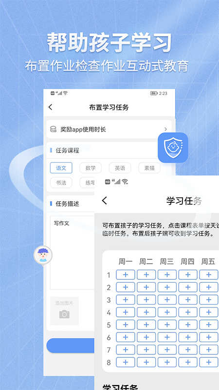 【助学习】家长可通过APP布置作业,检查作业,和孩子交流学习,解决学习问题,进行互动式教育。学习结束,解锁孩子手机中的娱乐软件,对作业完成优化的还可以奖励娱乐时长,劳逸结合,让孩子玩得更开心。
