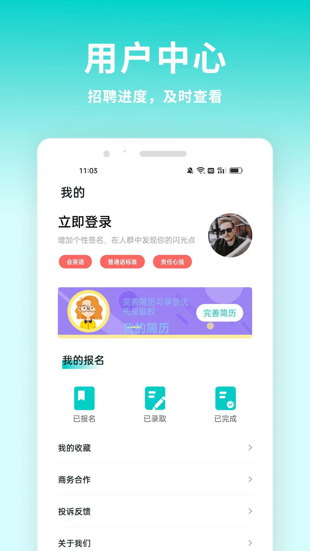 1.在个人中心里可以对自己的标签进行设置,寻找到更适合自己的工作。