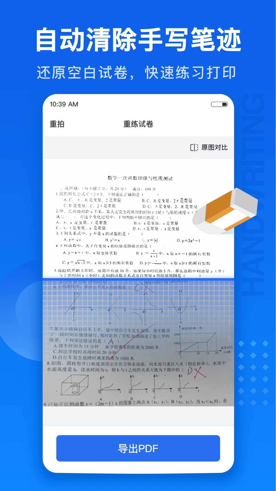 拍照识别试卷,自动清除手写笔迹,轻松还原干净空白试卷;