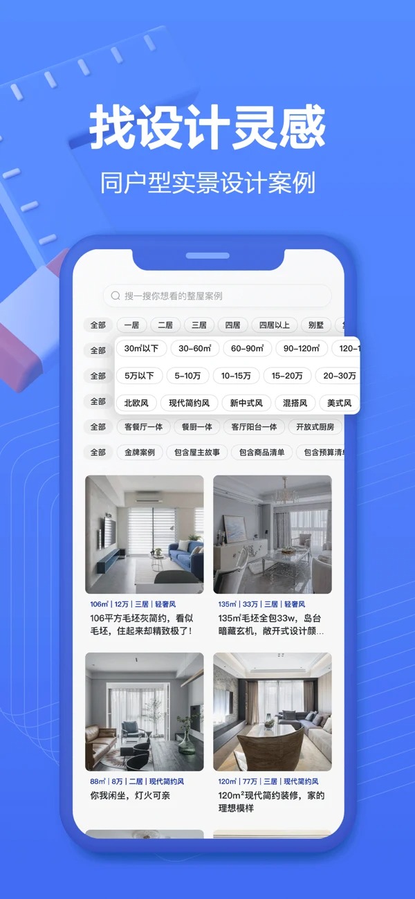 2、大数据精准算法,为用户轻松设计装修预算,费用更加合理,体验更自由。