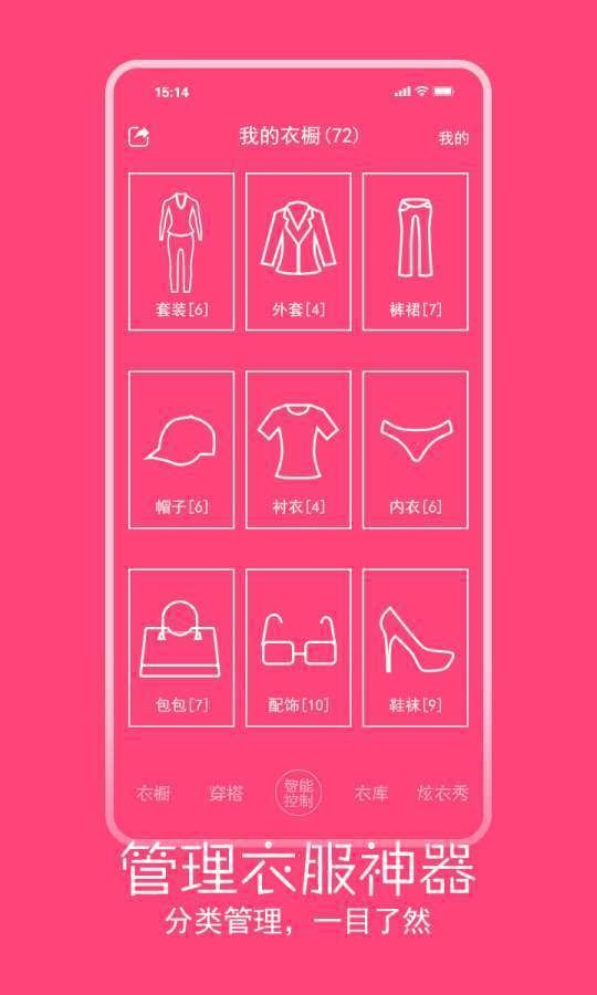 它能帮您上传,管理衣服,可以按照季节,颜色,场合分类管理。