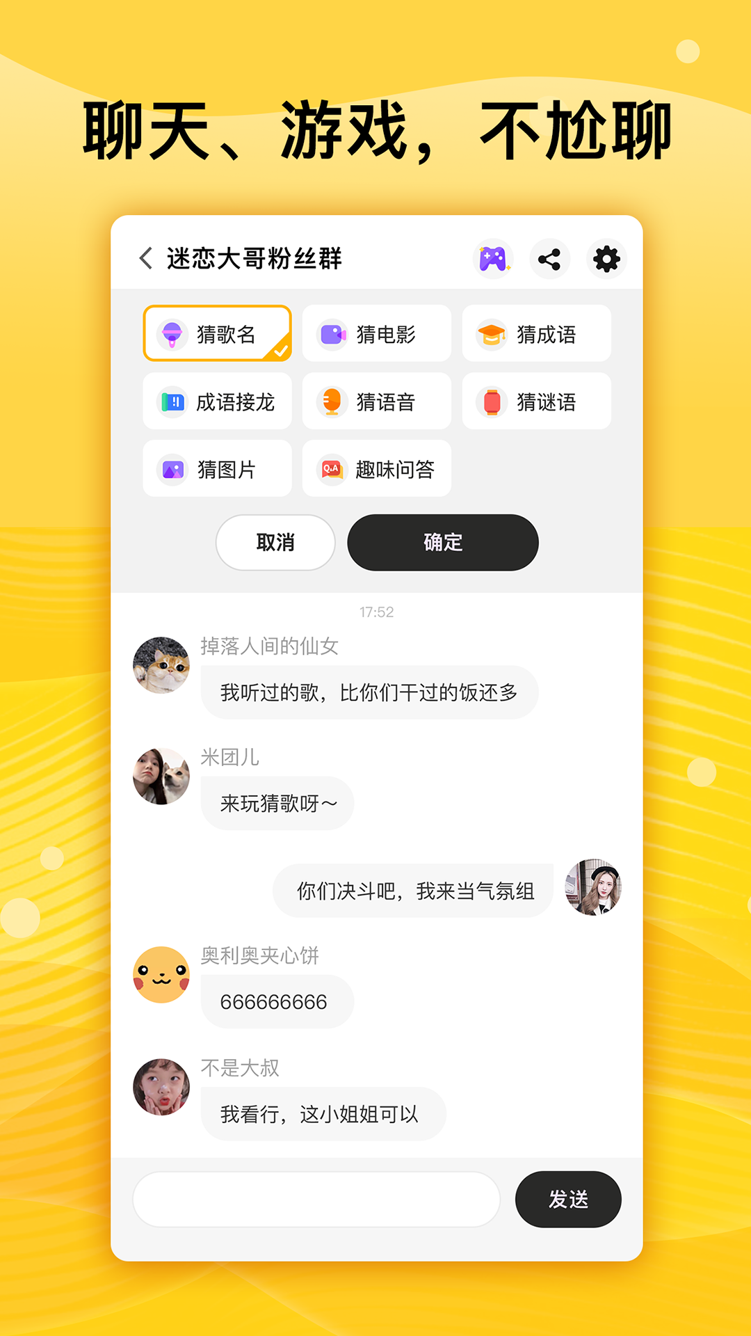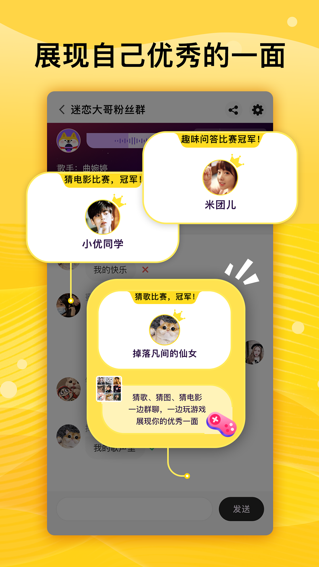 5、能够与好友或陌生人创建游戏房、组建群组游戏团队,游戏涵盖猜歌名、猜图片、猜语音、成语接龙等多种热门互动游戏;