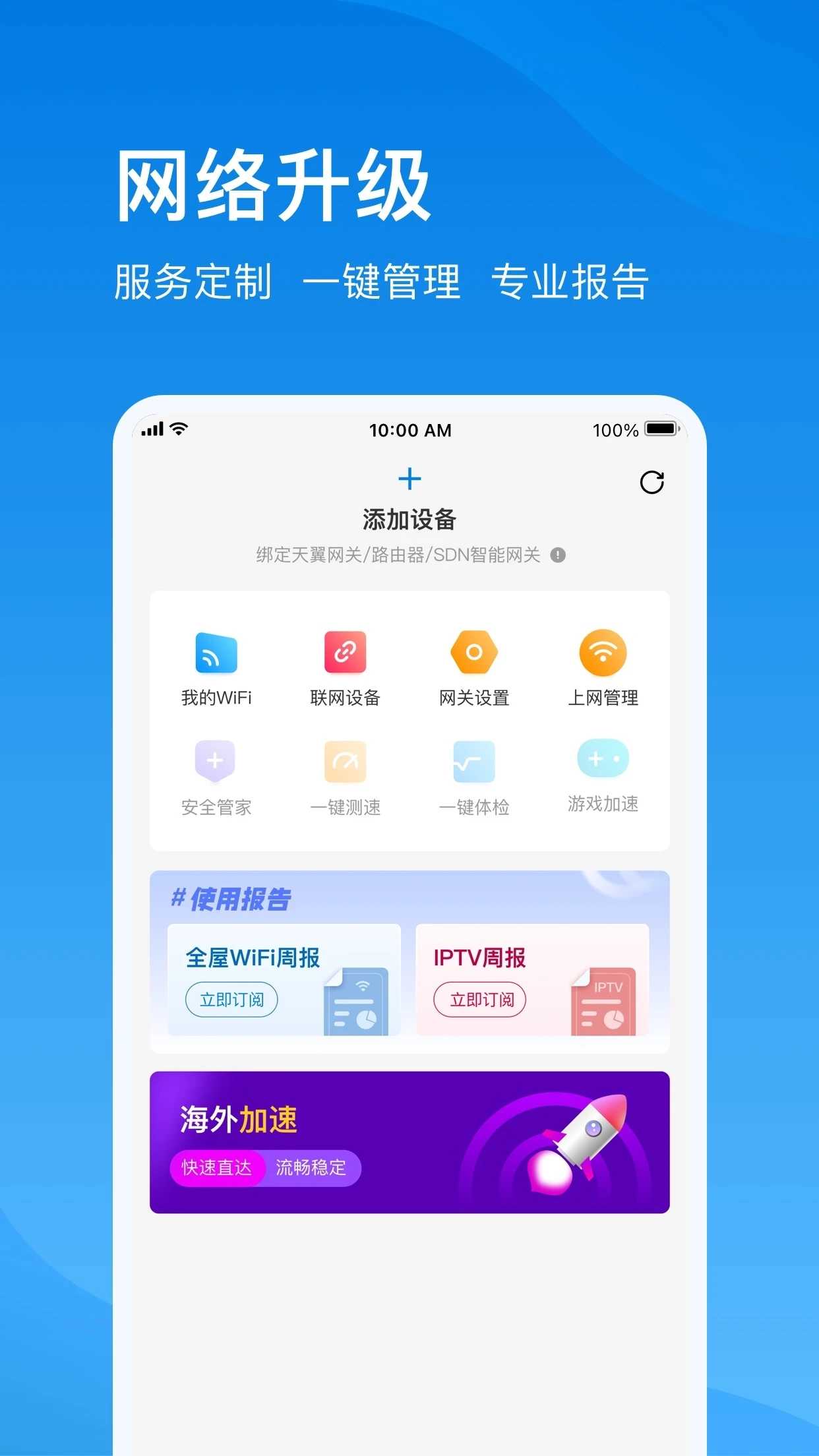 无论您身在何处,打开电信云宽带App,随时可享电信专属服务: